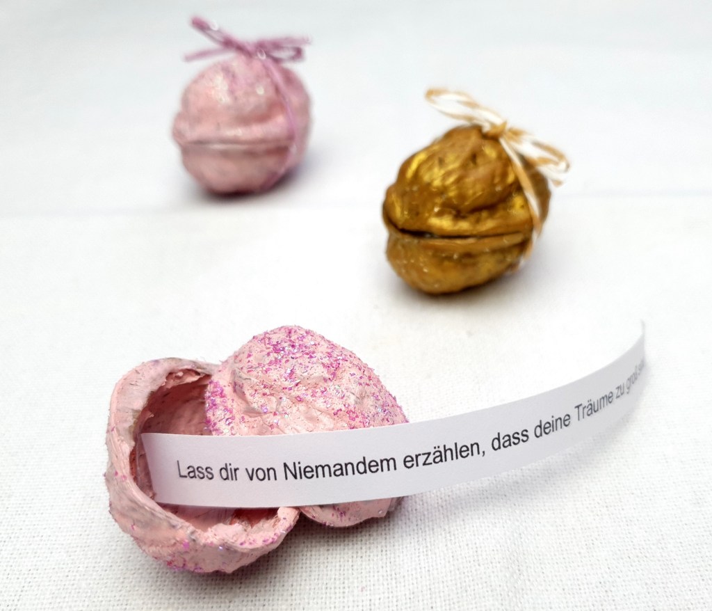 Wenn du keine Lust auf Basteln und Sprüche hast gibt es auch fertige Glücksnüsse, die mit verschiedenen Edelsteinen gefüllt sind: Überraschungsnüsse (Werbelink)