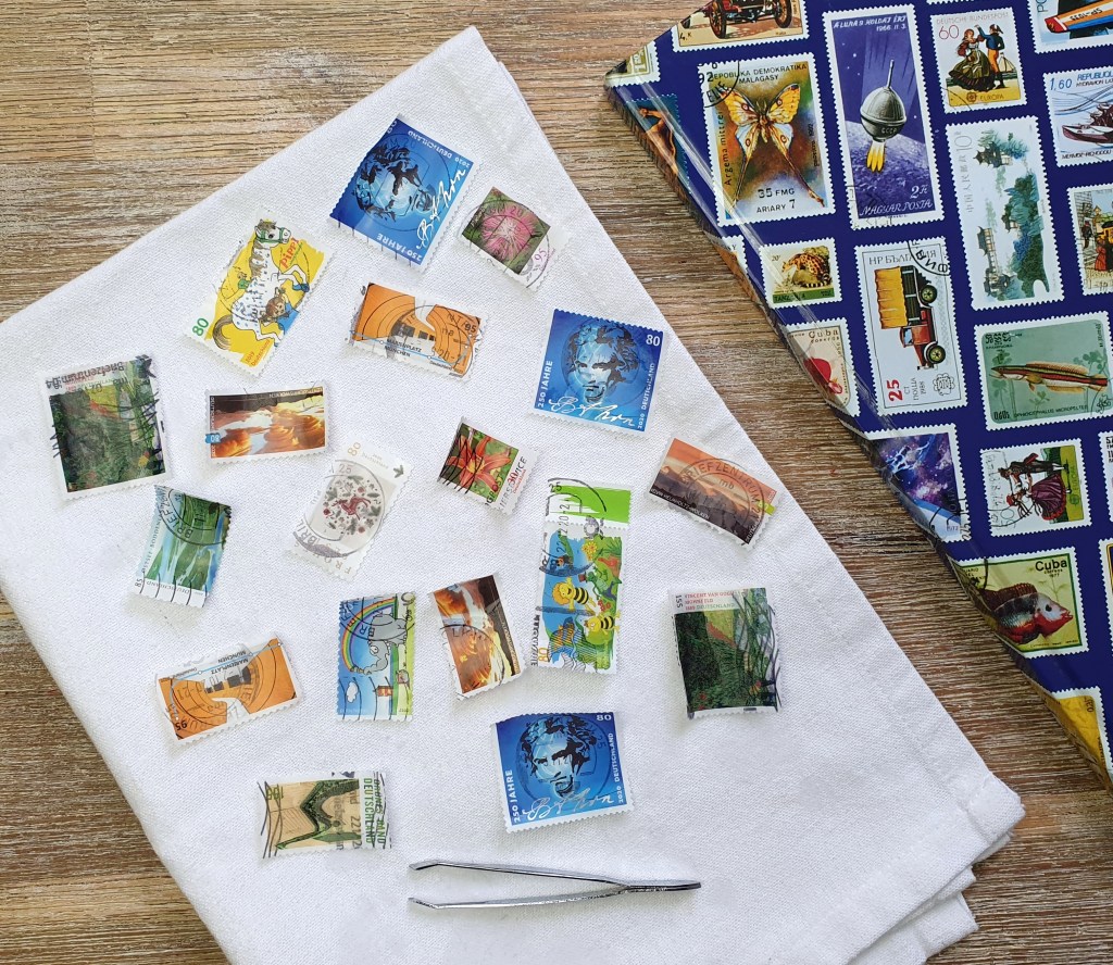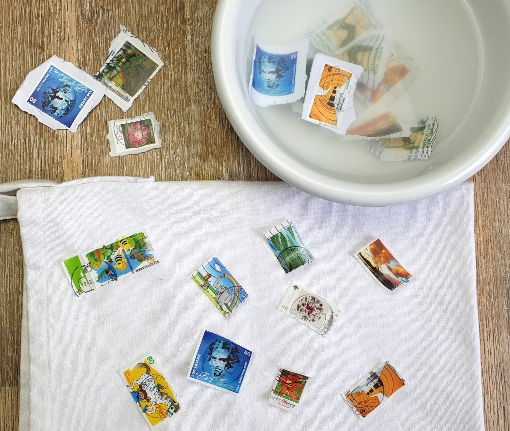 - zum Ablösen der Briefmarken: eine Schale mit kaltem Wasser und ein Geschirrhandtuch oder eine alte Zeitung zum Vortrocknen