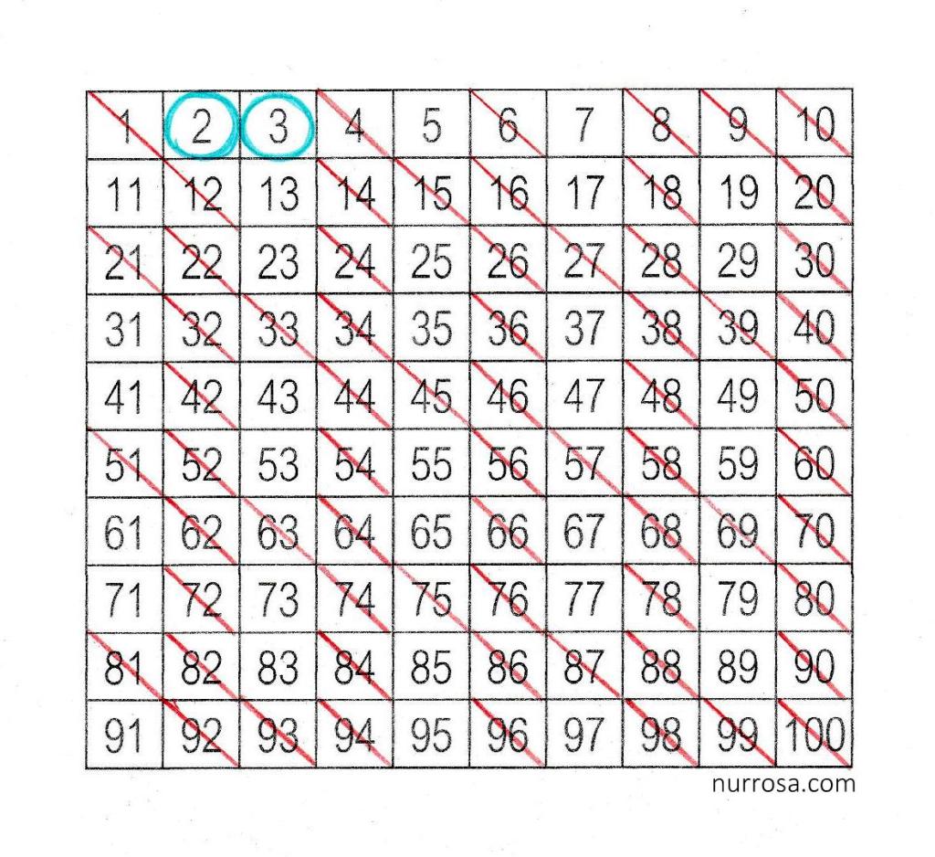 Die 2 ist die erste Primzahl und wird eingekreist (Regel 3: Die 2 ist die erste Primzahl und die einzige gerade Primzahl).