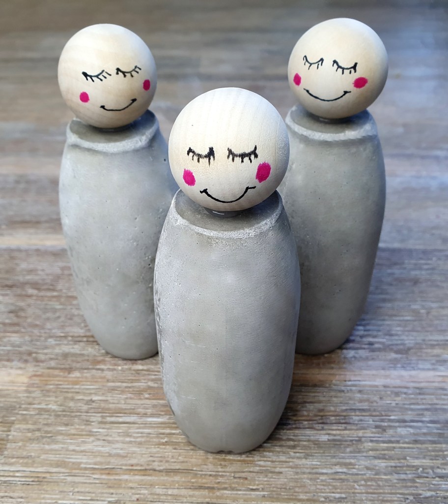 • Als nächstes malst du mit den Finelinern Gesichter auf die Holzkugeln und klebst jeweils eine Holzkugel mit etwas Heißkleber ober auf die Betonfigur.