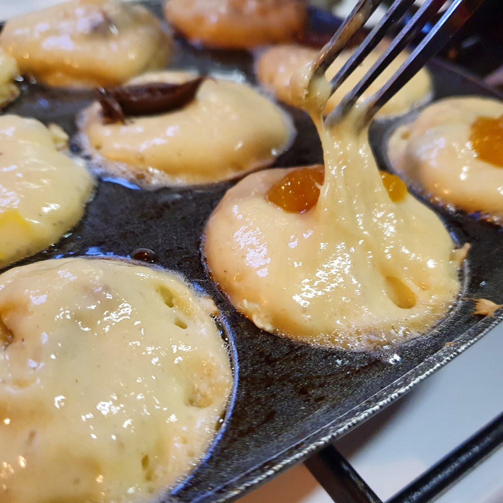 - Die Mulden der Pfüttenpfanne jeweils mit 1/2 TL Öl einpinseln und 1 EL Teig einfüllen.