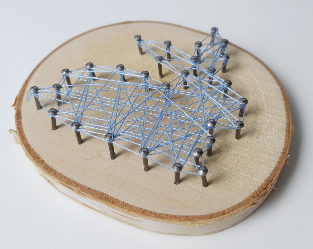 • Dann die Schablonen entfernen und an einem der Nägel einen Faden festknoten.