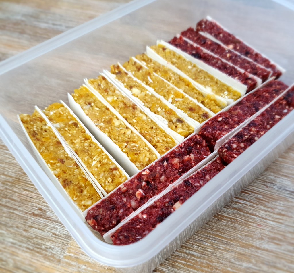 In einer verschlossenen Dose halten sich die Obstriegel im Kühlschrank ca. 5 Tage.